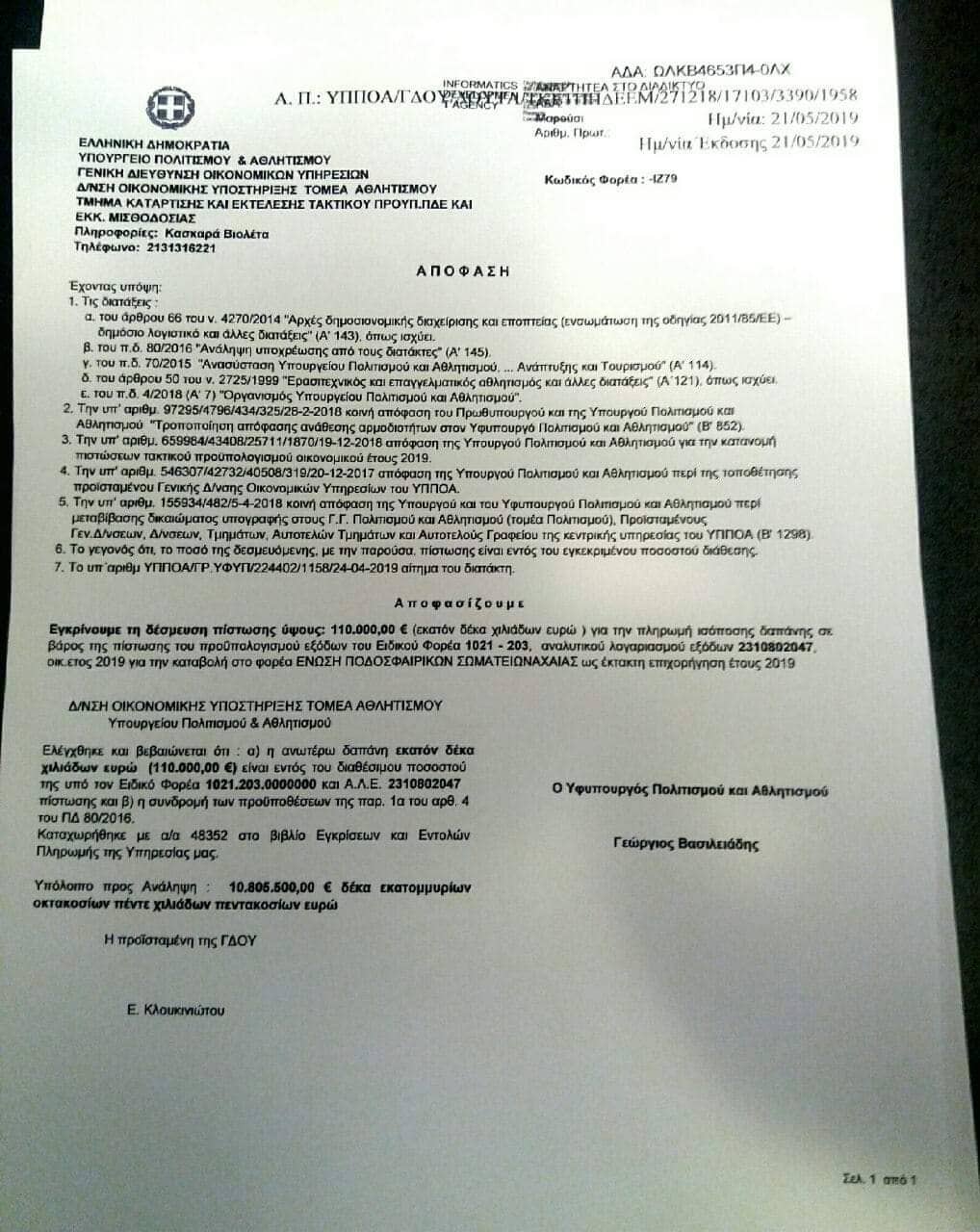 Ο υφυπουργός Αθλητισμού Γιώργος Βασιλειάδης ενέκρινε με κάθε επισημότητα το ποσό των 110.000 ευρώ για το γήπεδο «Α. Κάνιστρας».