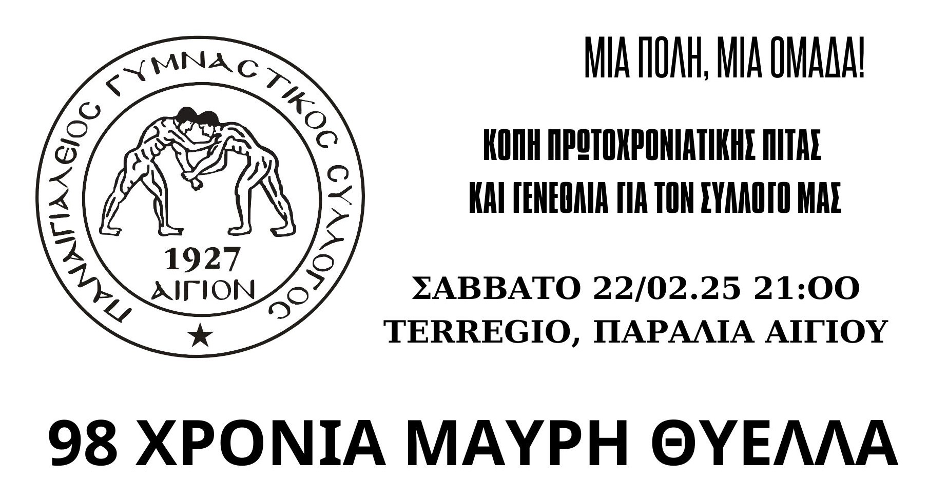 Ο Παναιγιάλειος Γυμναστικός Σύλλογος σας προσκαλεί το Σάββατο 22 Φεβρουαρίου 21:00 στην αίθουσα εκδηλώσεων Terregio στην παραλία του Αιγίου.