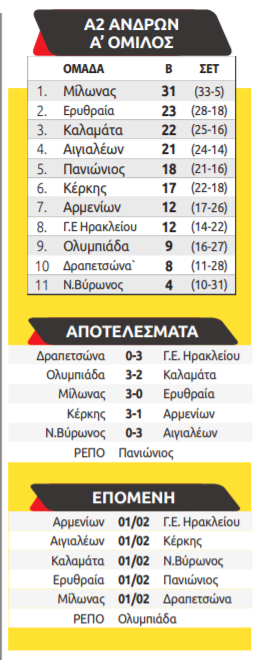 Σε αυτή την αγωνιστική ο πρωτοπόρος Μίλωνας επιβεβαίωσε πως είναι το απόλυτο αφεντικό στην κατηγορία, καθώς κέρδισε με «σκούπα» (3-0) εντός έδρας τον Πανερυθραϊκό.