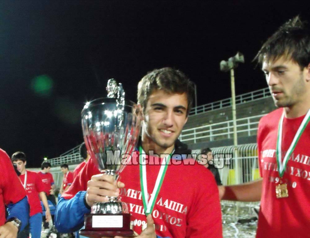Κυπελλούχος Αχαΐας με τον Ατρόμητο Λάππα, νικώντας στον τελικό της Κάτω Αχαγιάς τον Εθνικό Σαγεΐκων. Δίπλα του ο επίσης αδικοχαμένος σε τροχαίο Βαγγέλης Πασπαλιάρης