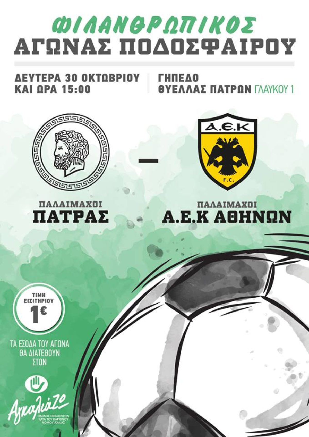 Την ερχόμενη Δευτέρα (31/10) και ώρα 15:00 θα πραγματοποιηθεί στο γήπεδο της Θύελλας Πατρών φιλανθρωπικός αγώνας ποδοσφαίρου μεταξύ των Παλαιμάχων Πάτρας και των Παλαιμάχων της ΑΕΚ.