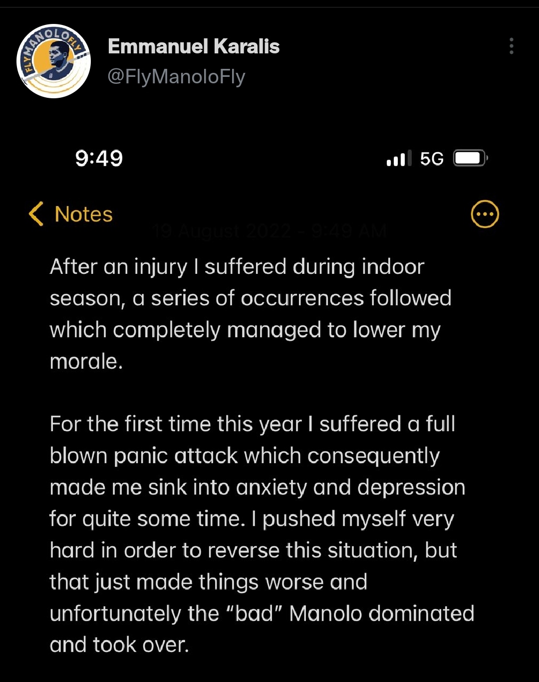 Εξηγώντας την απόφασή του, ο 22χρονος αθλητής του επί κοντώ αναφέρει ότι υπέστη φέτος μια κρίση πανικού, με αποτέλεσμα να «βυθιστεί» γι’ αρκετό καιρό στο άγχος και την κατάθλιψη.