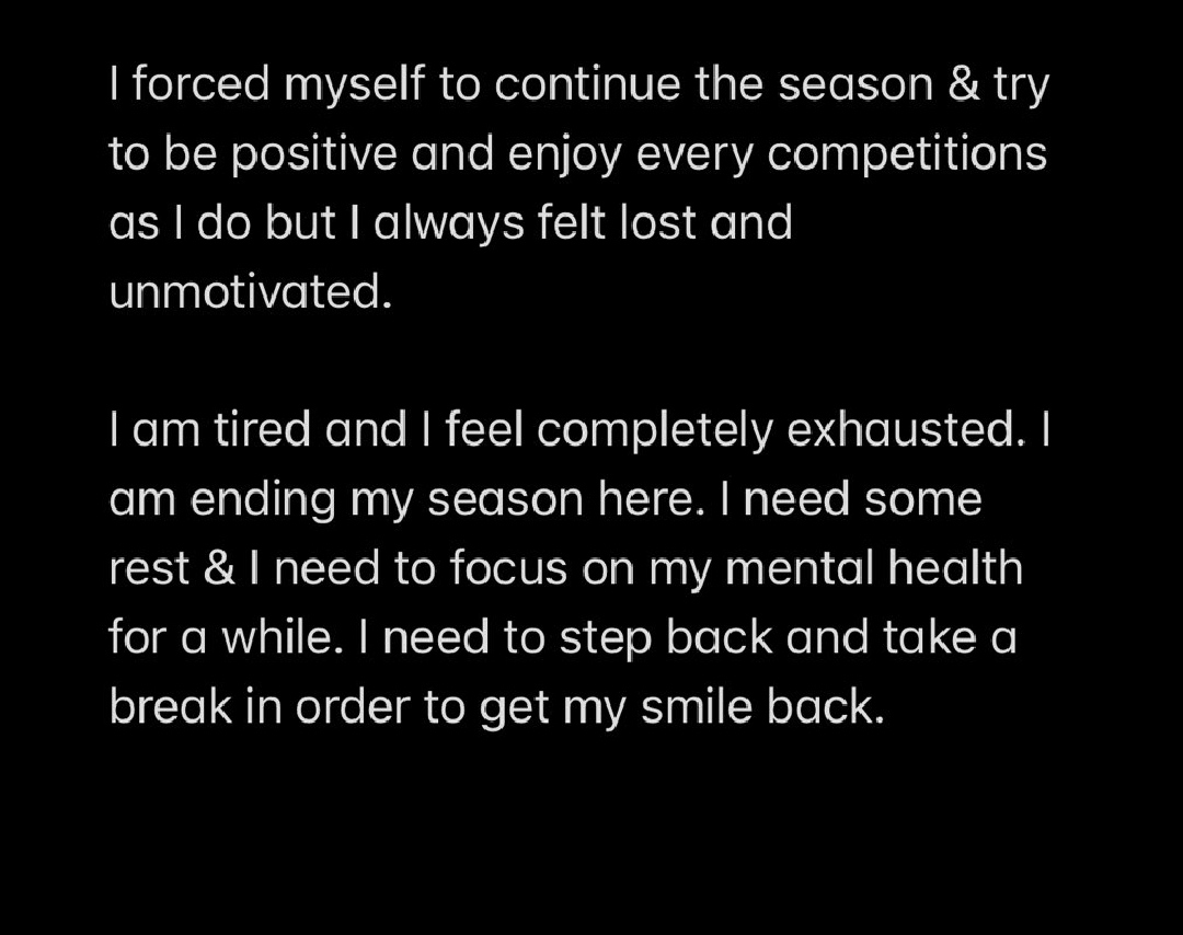 Είμαι κουρασμένος και αισθάνομαι εντελώς εξαντλημένος. Τελειώνω τη σεζόν μου εδώ. Χρειάζομαι λίγη ξεκούραση και έχω ανάγκη να επικεντρωθώ στην ψυχική υγεία μου για λίγο. Πρέπει να κάνω ένα βήμα πίσω και να κάνω ένα διάλειμμα, προκειμένου να ανακτήσω το χαμόγελό μου».