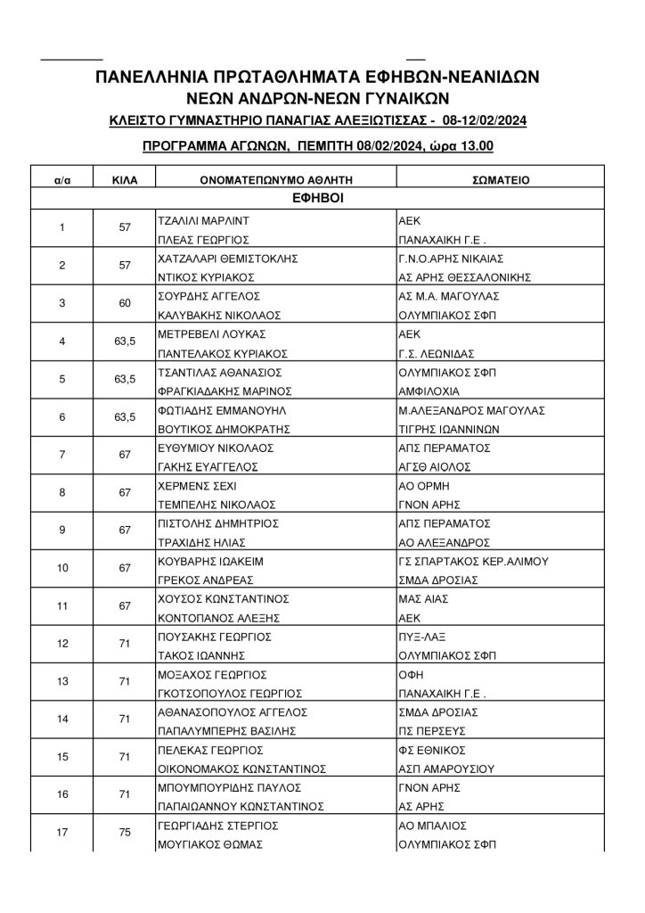 Ξεκινούν σήμερα στην Πάτρα και πιο συγκεκριμένα στο κλειστό της Γυμναστήριο Αλεξιώτισσας οι αγώνες για το πανελλήνιο πρωτάθλημα Εφήβων-Νεανίδων και Νέων Ανδρών και Γυναικών με τον Γιώργο Πλέα να ανοίγει την αυλαία των αναμετρήσεων.