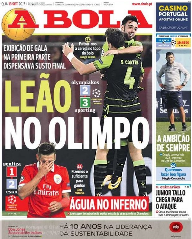 Άκρως εγκωμιαστικά σχόλια από τον πορτογαλικό Τύπο για την Σπόρτινγκ Λισσαβώνας, η οποία ήταν καλύτερη και νίκησε 3-2 τον Ολυμπιακό στο γήπεδο Καραϊσκάκη για την πρεμιέρα του Champions League.