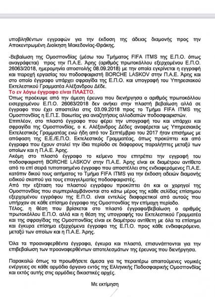 Αυτό προέκυψε από ένα έγγραφο που είχε τη σφραγίδα της ΕΠΟ και την υπογραφή του Αλέξη Δέδε, με το οποίο η Ομοσπονδία εμφανιζόταν να δηλώνει προς τον Άρη από το 2018 ότι παρέχει την έγκριση στον αθλητή για να εργαστεί ως επαγγελματίας ποδοσφαιριστής στον σύλλογο της Θεσσαλονίκης. Επίσης η υπηρεσία είχε και ένα συμβόλαιο του Άρη με τον αθλητή, μαζί με τις υπογραφές του Λάσκοφ και του Θόδωρου Καρυπίδη.