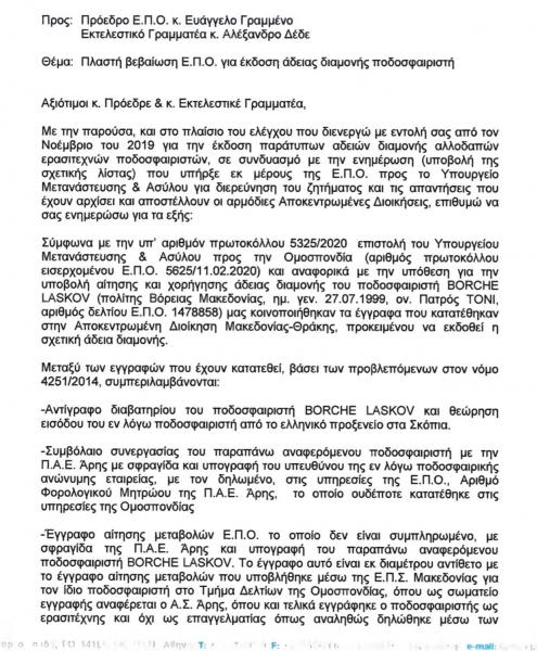 Για όσους δεν θυμούνται, όλα ξεκίνησαν μετά από ερώτημα της Γενικής Γραμματείας Μεταναστευτικής Πολιτικής, η οποία στις αρχές του 2020 απέστειλε ερώτημα προς την ΕΠΟ και προς το Υπουργείο Εξωτερικών για την άδεια παραμονής στην Ελλάδα ενός Βορειομακεδόνα ποδοσφαιριστή, του Μπόρτσε Λάσκοφ (Borce Lascov).