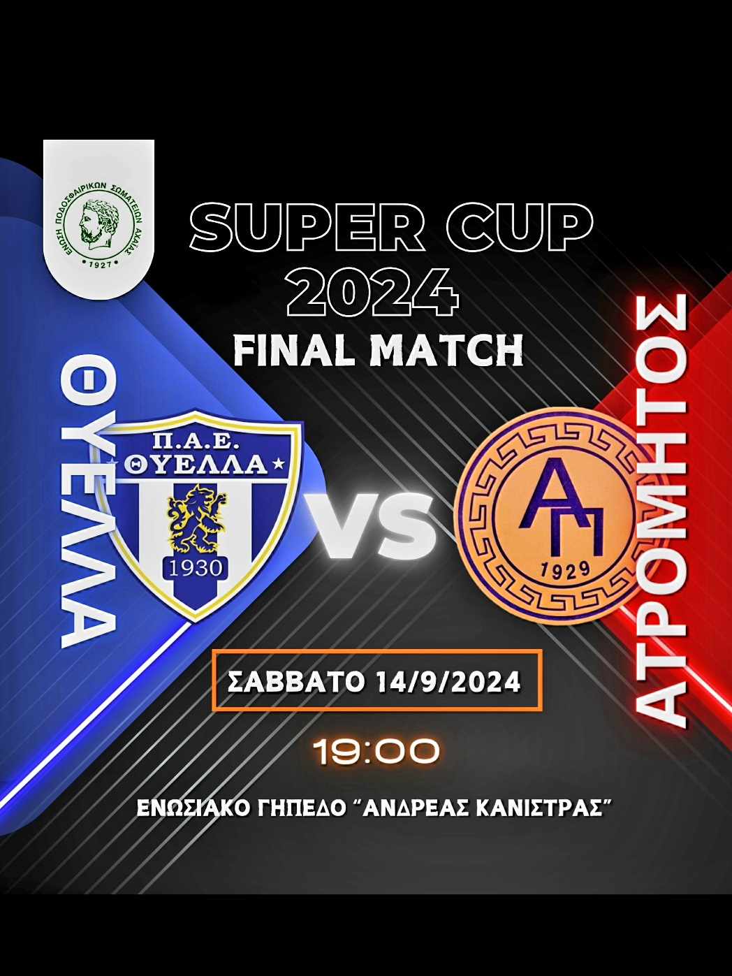 Ανοίγει σήμερα (14/9-19:00) η αυλαία στη νέα αγωνιστική περίοδο της ΕΠΣ Αχαΐας με τον τελικό του Σούπερ Καπ (17ος στο σύνολο).