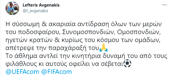 Το άθλημα αντλεί την κινητήρια δυναμή του από τους φιλάθλους κι αυτούς οφείλει να σέβεται”, έγραψε χαρακτηριστικά στον προσωπικό του λογαριασμό σε μέσο κοινωνικής δικτύωσης.