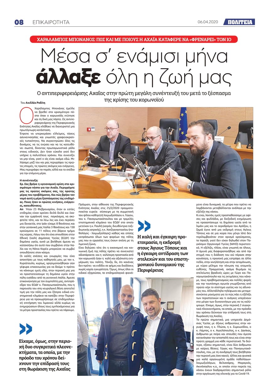 Ο Χαράλαμπος Μπονάνος έμελλε να βρεθεί στο κρισιμότερο πόστο όταν ο κορωνοϊός χτύπησε και τη δική μας πόρτα. Ως αντιπεριφερειάρχης της Περιφερειακής Ενότητας Αχαΐας κλήθηκε να διαχειριστεί μια πρωτόγνωρη κατάσταση.
