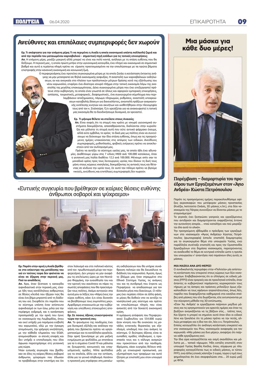 Απ. Η επόμενη μέρα, μοιάζει μακρινή αλλά μπορεί να είναι και πολύ κοντά, ανάλογα με τη στάση ευθύνης που θα δείξουμε. Η περιοχή μας, η οποία πρώτη μπήκε στην υγειονομική καταιγίδα, έχει πληγεί και οικονομικά σε σημαντικό βαθμό και αυτή η τεράστια πληγή πρέπει να είμαστε προετοιμασμένοι να την επουλώσουμε με τα πρώτα βήματα επιστροφής στην κανονική οικονομική και κοινωνική ζωή. Ο περιφερειάρχης έχει προτείνει συγκεκριμένα μέτρα με τα οποία ζητάει η κατάσταση έκτακτης ανάγκης να μην μετατραπεί σε θηλιά οικονομικής ασφυξίας. Η αναστολή των καρναβαλικών εκδηλώσεων, αν και αναγκαία στο πλαίσιο των προληπτικών μέτρων δράσης κατά της εξάπλωσης του νέου κορωνοϊού, επιφέρει ένα ιδιαίτερα ισχυρό πλήγμα στην τοπική οικονομία λόγω της αναστολής της μεγάλης επισκεψιμότητας.