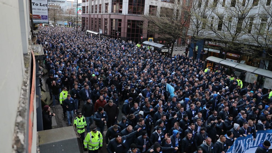 Πλάνο από την δυναμική παρουσία των φίλων των “Βασιλικών μπλε” στους δρόμους του Μάντσεστερ.