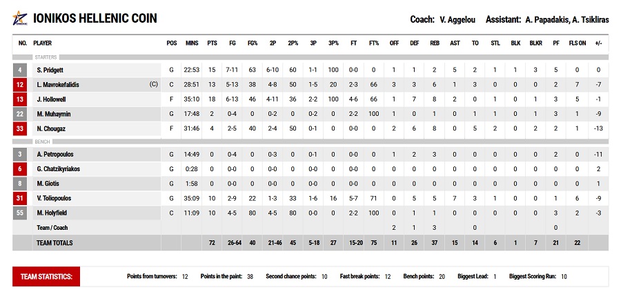 ΜΥΚΟΝΟΣ (Ζιάγκος): Άπλμπι 7 (1/3 τρίπ., 6ασ.), Μουρ 6, Ρέι 15 (3/5 τρίπ., 5ασ.), Καββαδάς 6, Ερμείδης 6 (1/1 τρίπ., 4ριμπ., 4ασ.), Σκουλίδας 10 (2), Σιδηροηλίας 3, Μάντζαρης 9 (3/3 τρίπ.), Κάναντι 6, Έβανς 19 (2/2 τρίπ., 9 ριμπ.).
