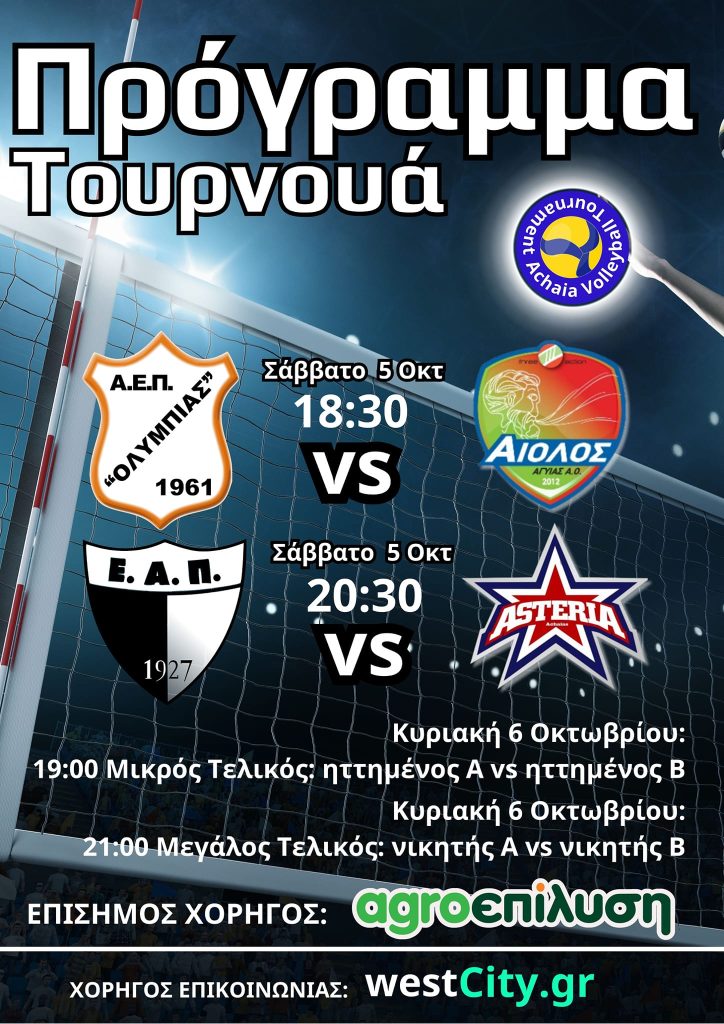 Τουρνουά βόλεϊ διοργανώνουν το ερχόμενο Σαββατοκύριακο (5-6/10) τα Αστέρια Αχαΐας, με τη συμμετοχή της Ολυμπιάδας, της ΕΑΠ και του Αίολου.