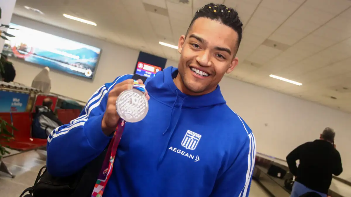 Ο Εμμανουήλ Καραλής “μόστραρε” το μετάλλιό του από το παγκόσμιο πρωτάθλημα κλειστού στίβου στην επιστροφή της ελληνικής αποστολής από την Κίνα και δήλωσε ότι μπορεί να είναι ασημένιο, αλλά για τον ίδιο είναι σαν χρυσό.