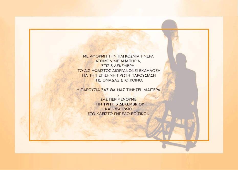 Σε ακόμα μία αξιέπαινη εκδήλωση προβαίνει ο σύλλογος Α.Σ. ΑμεΑ Ήφαιστος, που σε λίγο καιρό ξεκινάει τις επίσημες αγωνιστικές υποχρεώσεις του στο πρωτάθλημα του μπάσκετ με αμαξίδιο.