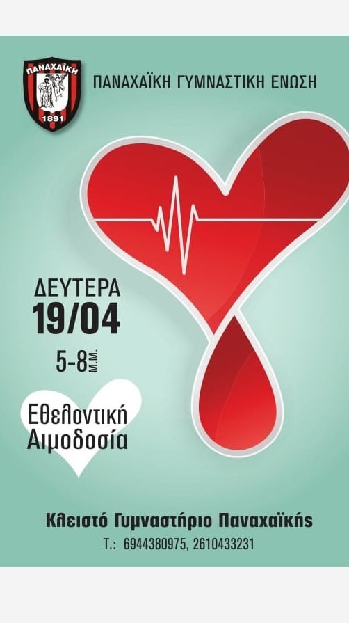 Εθελοντική αιμοδοσία αναμένεται να πραγματοποιηθεί σήμερα, Δευτέρα (19/4) στο Κλειστό Γυμναστήριο της Ερασιτεχνικής Παναχαϊκής στην Αγυιά, από την ΠΓΕ.