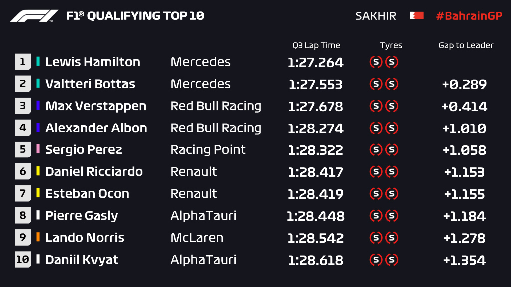 Από κοντά ακολούθησε και ο Βάλτερι Μπότας που ήρθε δεύτερος, ενώ τρίτος τερμάτισε ο Μαξ Φερστάπεν. Τέταρτος ήρθε ο έτερος οδηγός της Red Bull, Αλεξάντερ Άλμπον ενώ την πεντάδα έκλεισε ο Σέρχιο Πέρεθ.