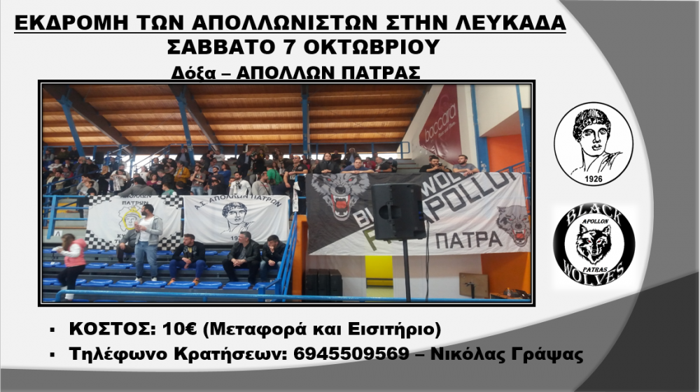 Η Λέσχη Φιλάθλων Απόλλων Πάτρας Black Wolves σε συνεργασία με την διοίκηση του συλλόγου διοργανώνει εκδρομή στην Λευκάδα το Σάββατο 7 Οκτωβρίου για τον αγώνα της ομάδας της Πόλης εναντίον της τοπικής Δόξας.