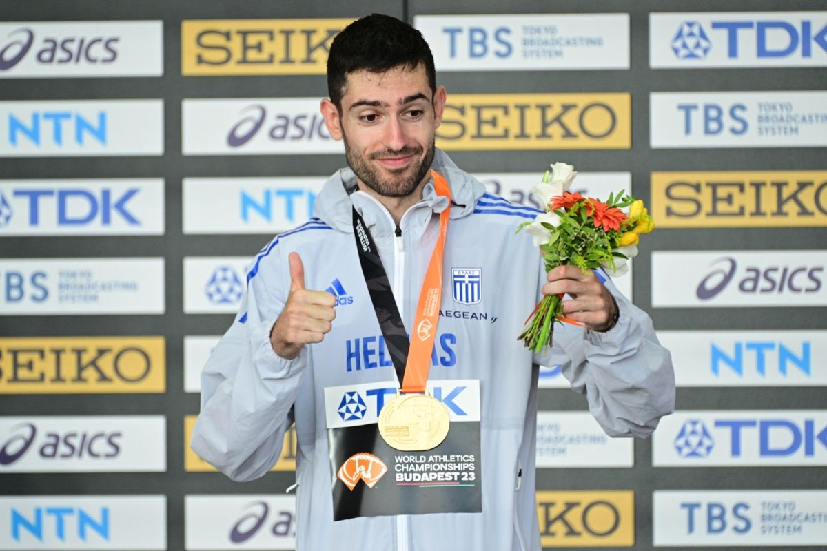 Ο Μίλτος Τεντόγλου παρέλαβε το χρυσό μετάλλιο για την κατάκτηση της πρώτης θέσης στο μήκος του Παγκοσμίου πρωταθλήματος της Βουδαπέστης