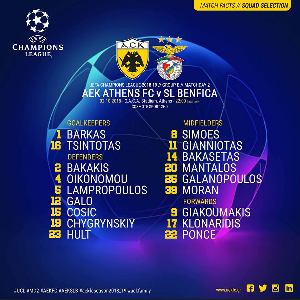Η αποστολή της ΑΕΚ για Μπενφίκα