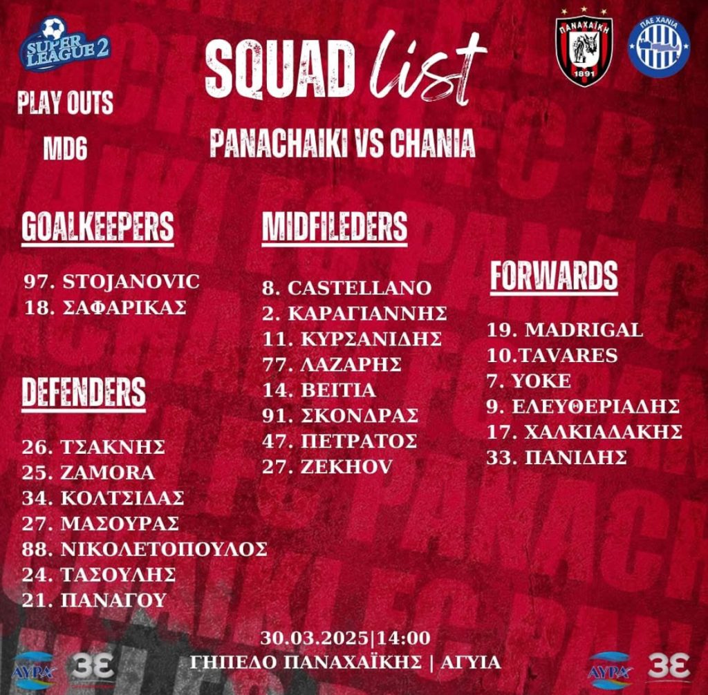 Με πρωινή προπόνηση στο γήπεδό της στην Αγυιά, ολοκληρώθηκε η προετοιμασία της Παναχαϊκής για την εντός έδρας αναμέτρηση της Κυριακής (30/03, 14:00, Live ενημέρωση από το matchnews.gr) με τα Χανιά, στο πλαίσιο της 6ης αγωνιστικής των Play Outs της Super League 2.