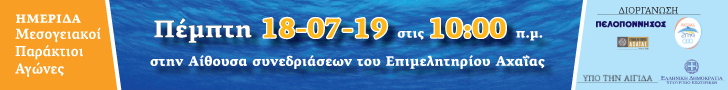 Στο πλαίσιο των Μεσογειακών Παράκτιων Αγώνων και υπό την Αιγίδα του Υπουργείου Εξωτερικών, η εφημερίδα «ΠΕΛΟΠΟΝΝΗΣΟΣ», το Επιμελητήριο Αχαΐας και η Ο.Ε. Μεσογειακών Παράκτιων Αγώνων οργανώνουν την ημερίδα «Μεσογειακοί Παράκτιοι Αγώνες», την Πέμπτη 18 Ιουλίου 2019, στις 10.00 π.μ., στην Αίθουσα Συνεδριάσεων Επιμελητηρίου Αχαΐας.
