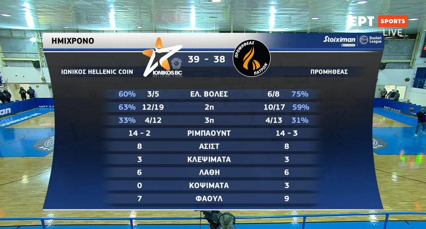 ΙΩΝΙΚΟΣ: 12/19 δίποντα, 4/12 τρίποντα, 3/5 βολές, 16 ριμπάουντ, 8 ασίστ, 3 κλεψίματα, 6 λάθη.