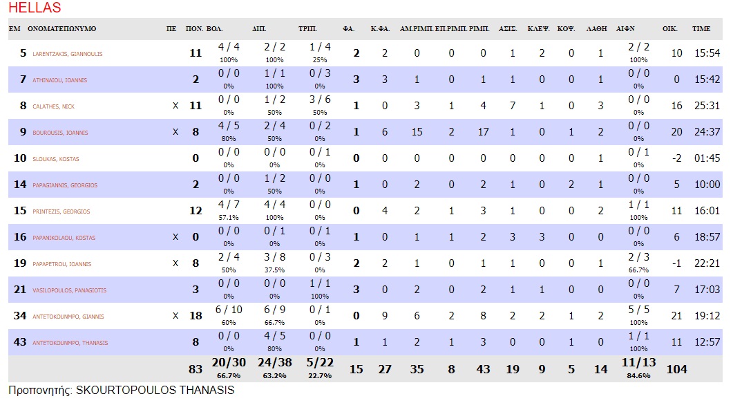 ΑΠΟΛΛΩΝ (Ελευθεριάδης): Κίερ 10 (3/6διπ., 0/3τρ.), Χείλαρης, Ανέστης 25 (5/9διπ., 3/12τρ., 4ριμπ., 3 ασίστ, 4κλεψ.), Ζούμπος 5 (1/7τρ.), Κώττας 4 (αρχική 5άδα), Παπαφωτίου, Αθανασόπουλος 2, Μανάκας 12 (5/6 σουτ), Παύλος 9 (3/11τρ.).