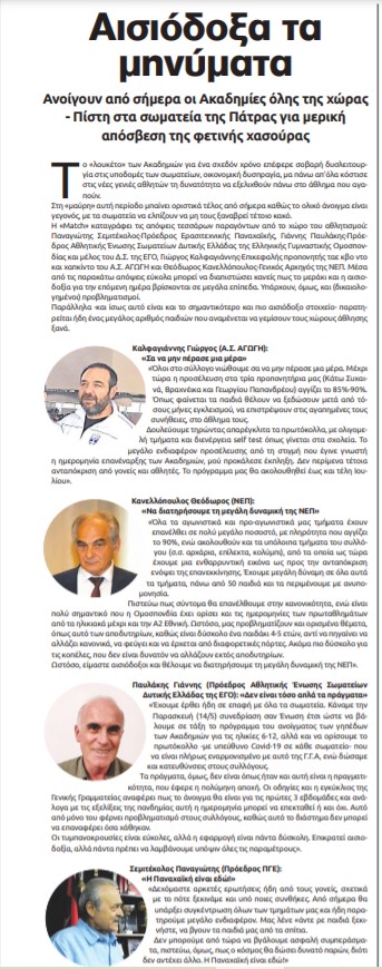 Η «Match» καταγράφει τις απόψεις τεσσάρων παραγόντων από το χώρο του αθλητισμού: Παναγιώτης Σεμιτέκολος-Πρόεδρος Ερασιτεχνικής Παναχαϊκής, Γιάννης Παυλάκης-Πρόεδρος Αθλητικής Ένωσης Σωματείων Δυτικής Ελλάδας της Ελληνικής Γυμναστικής Ομοσπονδίας και μέλος του Δ.Σ. της ΕΓΟ, Γιώργος Καλφαγιάννης-Επικεφαλής προπονητής ταε κβο ντο και χαπκίντο του Α.Σ. ΑΓΩΓΗ και Θεόδωρος Κανελλόπουλος-Γενικός Αρχηγός της ΝΕΠ.