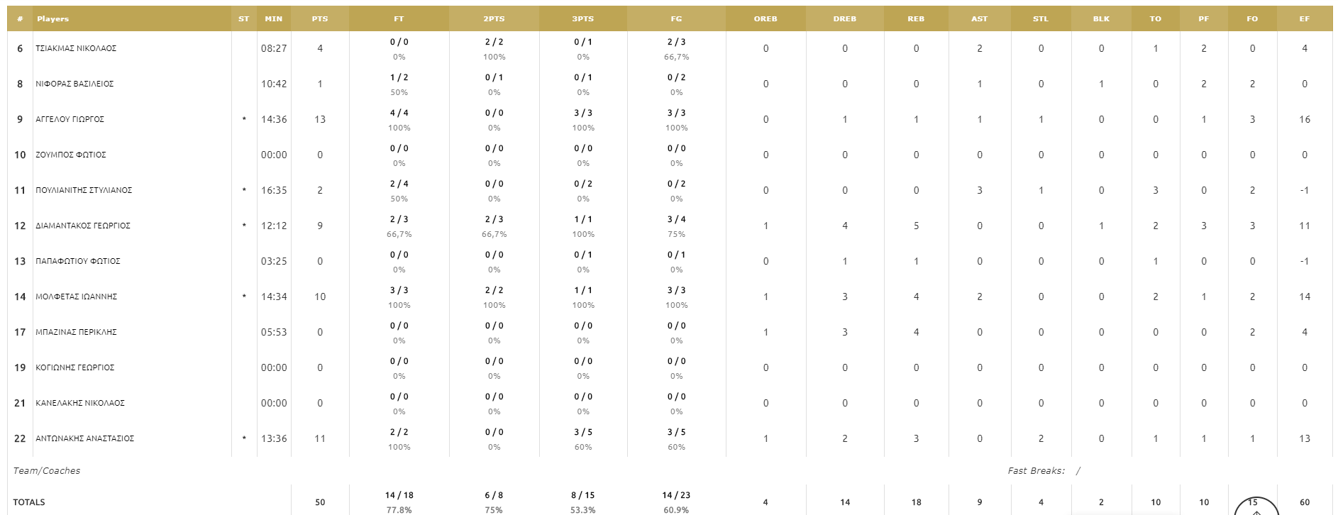 Κρόνος Αγ. Δημητρίου (Καραμπάς): Ντελόνει 12 (2), Τουτζιαράκης 7 (1) , Παπαδιονυσίου 12, Τσουργιάννης 8, Πιουσκουλόγλου, Μοτσενίγος 8 (2), Μαστόρος 23 (3), Καραλευθέρης 1, Τσάβος 2, Ψημίτης 5, Δημητρίου.