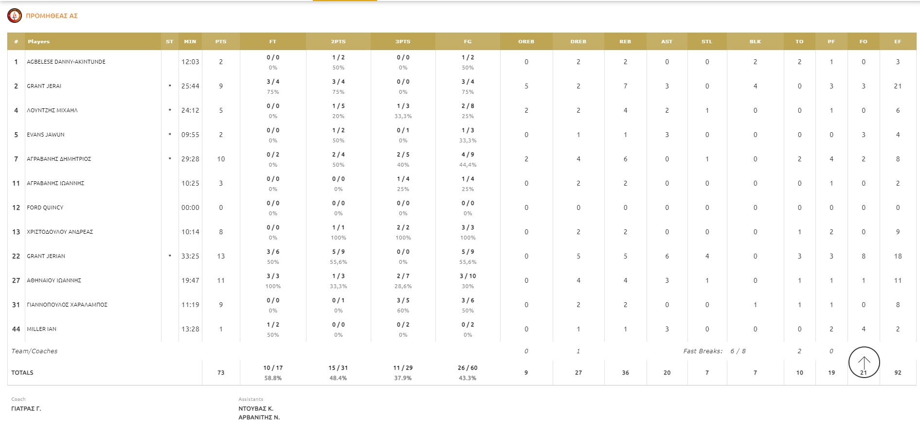 Ο Τζέριαν Γκραντ έκανε τα… πάντα στο παρκέ (13π., 6ασ., 4κλ., 3ριμπ.), ο Γιάννης Αθηναίου έβαλε μεγάλα καλάθια στα κρίσιμα σημεία (11π., 4ριμπ., 3ασ.) ενώ ο Αλέξης Χριστοδούλου ήταν εκείνος που έδωσε το έναυσμα για την επιστροφή της ομάδας του στο ματς.