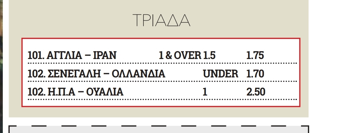 Κλειστό παιχνίδι θα είναι αυτό ανάμεσα σε Ολλανδία και Σενεγάλη (σημαντική η απώλεια του Μανέ) και θα επιλέξουμε το under που πληρώνει 1.70, ενώ στο ματς των ΗΠΑ με την Ουαλία, θα πάμε με το 2.50 των Αμερικανών, που διαθέτουν παραπάνω φρεσκάδα.