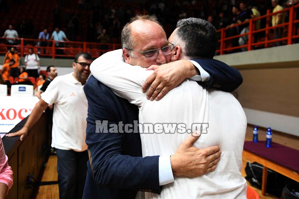 Με την κόρνα της λήξης, πρώτη ενέργεια του Βαγγέλη Λιόλιου ήταν να σπεύσει προς το μέρος του Μάκη Γιατρά, απ’ όπου και ο θερμός εναγκαλισμός.