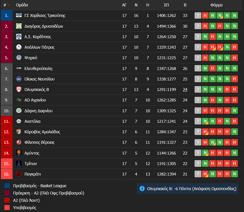 Η Βαθμολογία (σε 17 παιχνίδια)