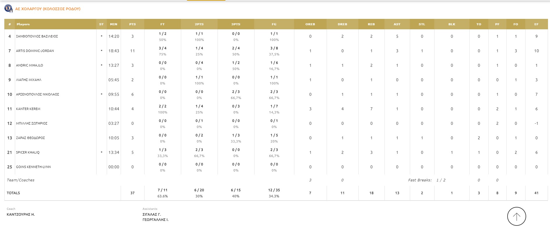 Τα ομαδικά στατιστικά του Κολοσσού: 6/20 δίποντα, 6/15 τρίποντα, 7/11 βολές, 18 ριμπάουντ, 13 ασίστ, 2 κλεψίματα, 1 μπλοκ