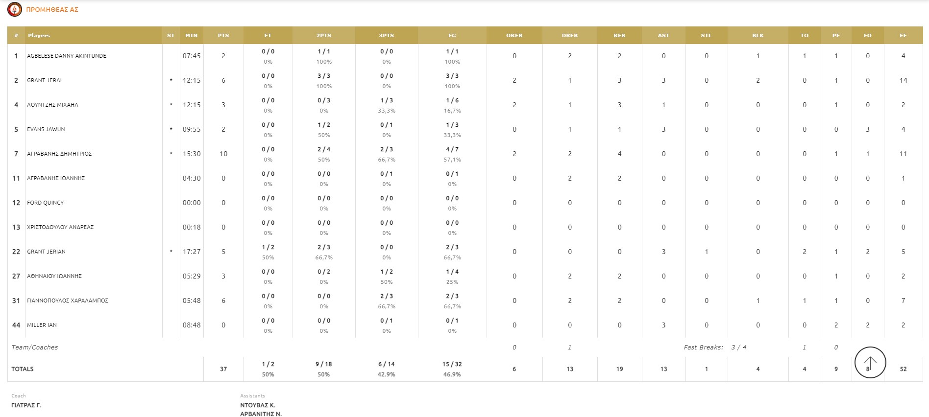 ΠΡΟΜΗΘΕΑΣ (Λιμνιάτης): Χάμοντς 20 (6/9 δίποντα, 2/5 τρίποντα, 2/3 βολές), Κόουλμαν 7 (3/5 δίποντα, 8 ριμπάουντ), ΜακΚάλουμ 7 (2/5 σουτ, 3/4 βολές, 3 ριμπάουντ, 8 ασίστ, 4 κλεψίματα, 5 λάθη), Καραγιαννίδης 9 (4/7 δίποντα, 1/5 βολές, 10 ριμπάουντ), Γκρέι 14 (3/10 δίποντα, 2/7 τρίποντα, 2/3 βολές), Πλώτας, Μπαζίνας, Λάγιος, Κομνιανίδης, Πόλικαπ 7, Μακούρα 15 (2/4 δίποντα, 3/5 τρίποντα, 2/2 βολές), Σταυρακόπουλος.