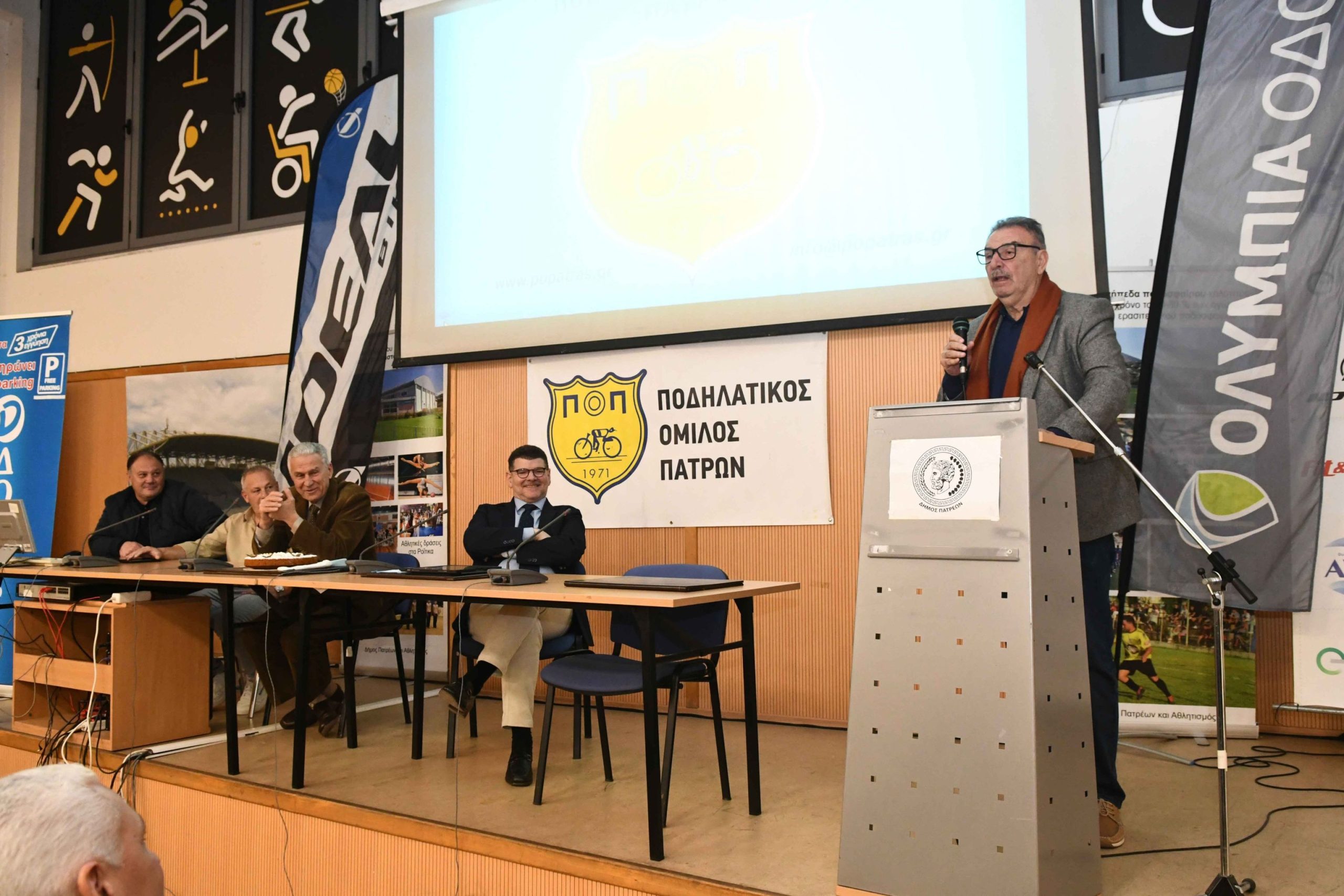 Στον χαιρετισμό του στον Ποδηλατικό Όμιλο ο Αντιδήμαρχος μετέφερε τις ευχές του Δημάρχου Πατρέων Κώστα Πελετίδη, για δύναμη και καλή χρονιά με υγεία και αναφέρθηκε, αφ’ ενός στον αναβαθμισμένο πολύπλευρο ρόλο του ποδηλάτου ως άθλημα, αναψυχή και μεταφορικό μέσο στις σύγχρονες κοινωνίες της αλόγιστης επιβάρυνσης του περιβάλλοντος με ρίπους και αφ’ ετέρου στο στρατηγικό σχέδιο ανάπτυξης ολοκληρωμένου δικτύου ποδηλατοδρόμων της Δημοτικής Αρχής, η υλοποίηση του οποίου είναι σε εξέλιξη.
