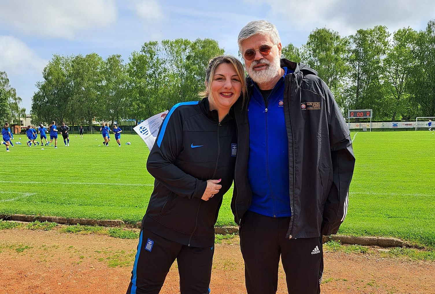 Στη φωτογραφία με την Αριστέα Ρόμπολα, πρόεδρο της επιτροπής γυναικείων σωματείων της ΕΠΣ Αχαΐας.
