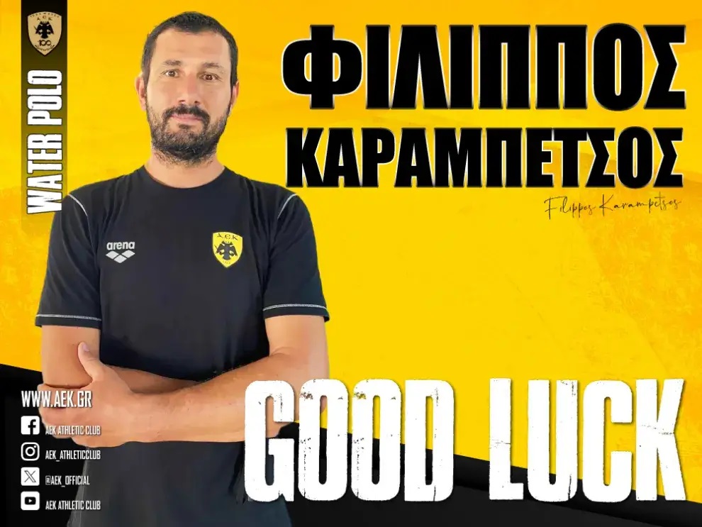 «Η ΑΕΚ ανακοινώνει ότι ο μέχρι πρότινος τερματοφύλακας της ανδρικής ομάδας Πόλο, Φίλιππος Καραμπέτσος, αναλαμβάνει θέση στο τεχνικό επιτελείο του Νίκου Βενετόπουλου.