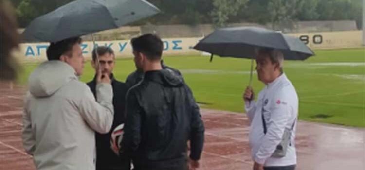 Αφού διαπίστωσε ότι αυτό δεν συμβαίνει ενημέρωσε τους ανθρώπους και των δύο ομάδων ότι το παιχνίδι θα αναβληθεί και θα γίνει αύριο Δευτέρα 29/9 την ίδια ώρα και στον ίδιο χώρο στο Στάδιο του νησιού, αν το επιτρέψουν οι καιρικές συνθήκες.