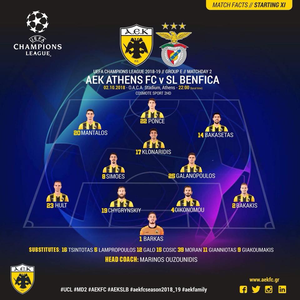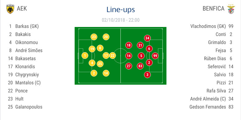 Οι ενδεκάδες των ΑΕΚ και Μπενφίκα