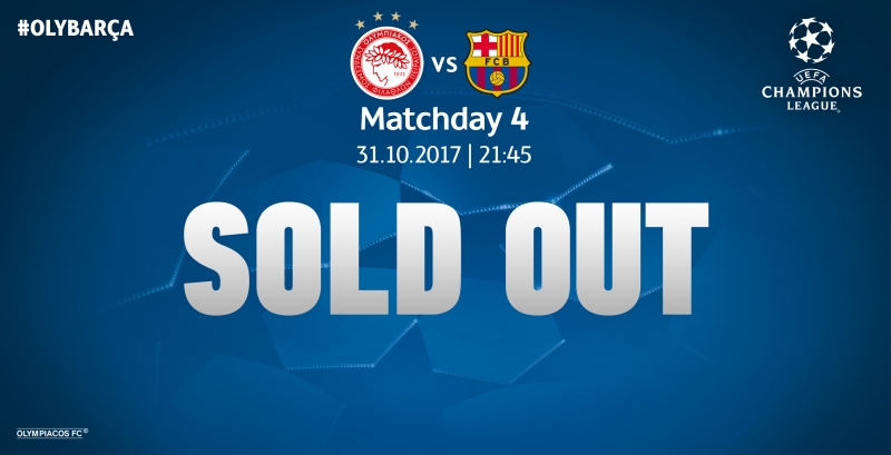 “Η ΠΑΕ Ολυμπιακός ανακοινώνει την εξάντληση των εισιτηρίων για την 4η αγωνιστική του εφετινού UEFA Champions League και τον αγώνα με αντίπαλο την Μπαρτσελόνα, στο γήπεδο Καραϊσκάκη”.