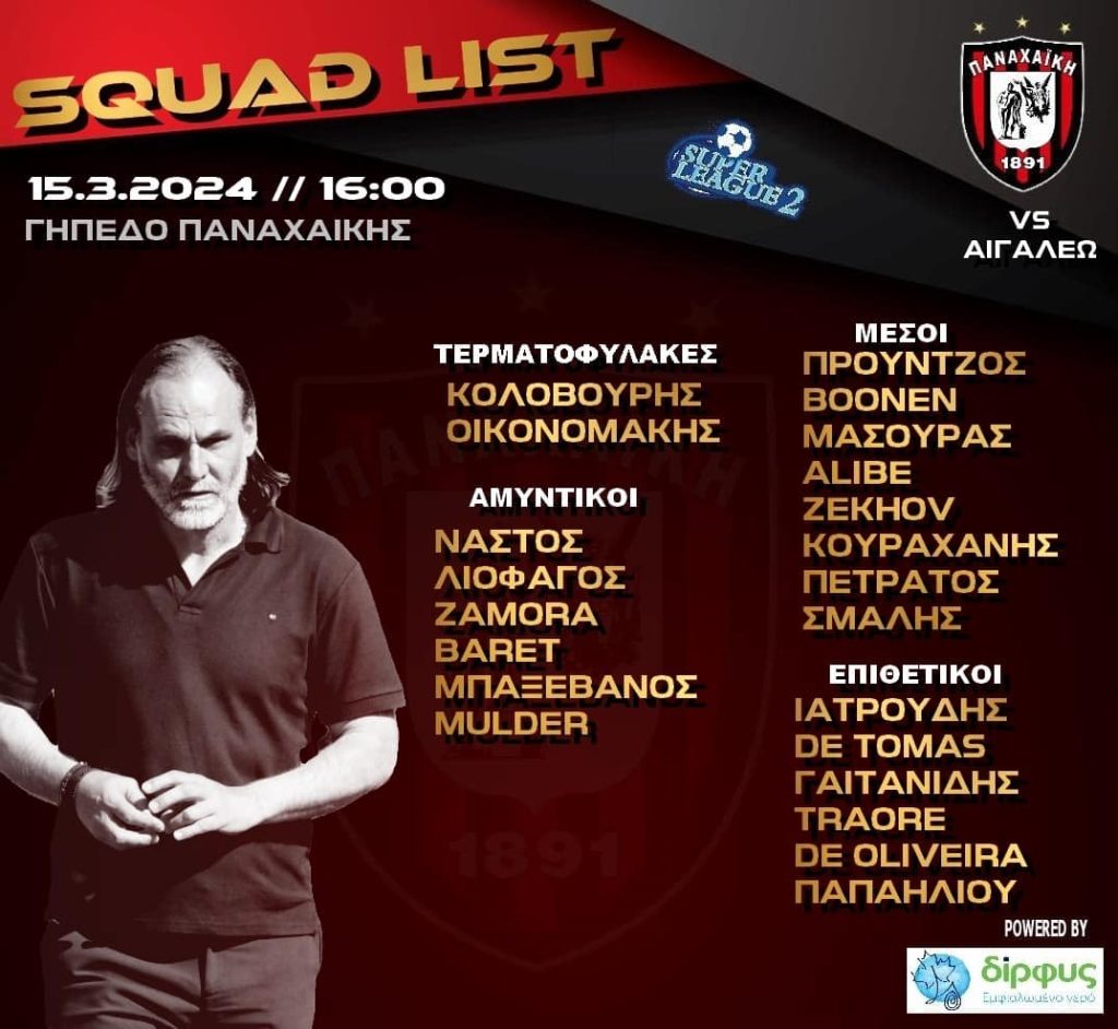 Με 22 παίκτες και αρκετές απουσίες θα παραταχθεί η Παναχαϊκή στον πολύ σημαντικό αγώνα της Δευτέρας (15/04, 16:00) με το Αιγάλεω στην Αγυιά, για την 5η αγωνιστική των πλέι άουτ στον Νότιο Όμιλο της Super League 2.