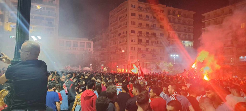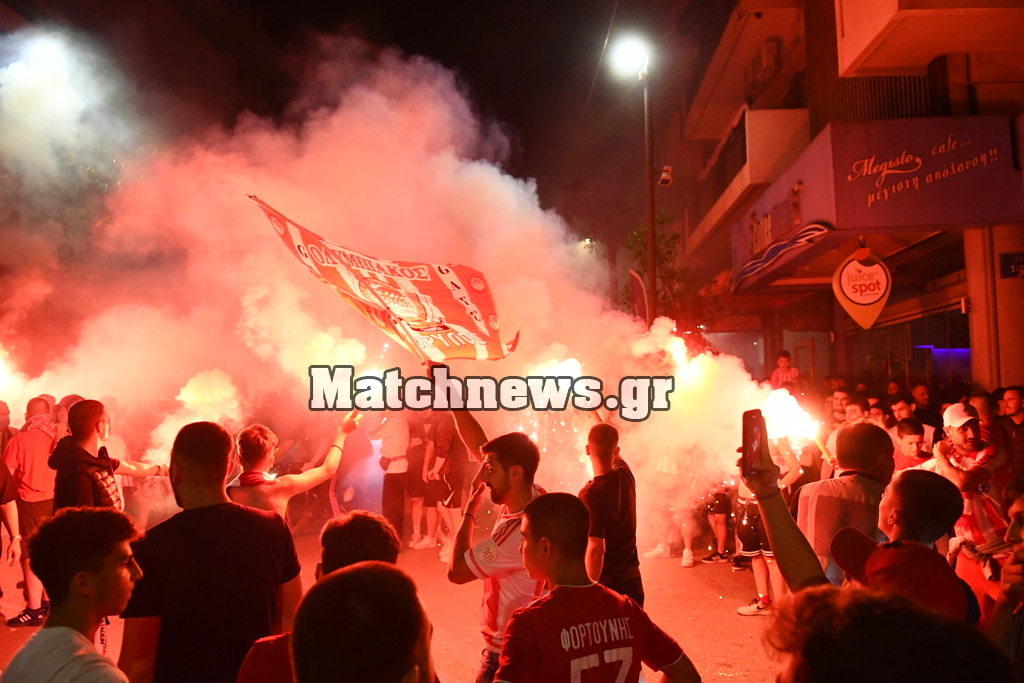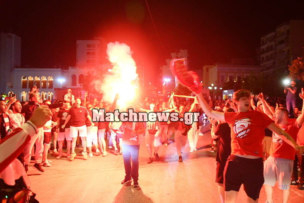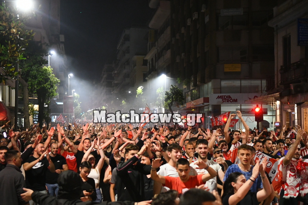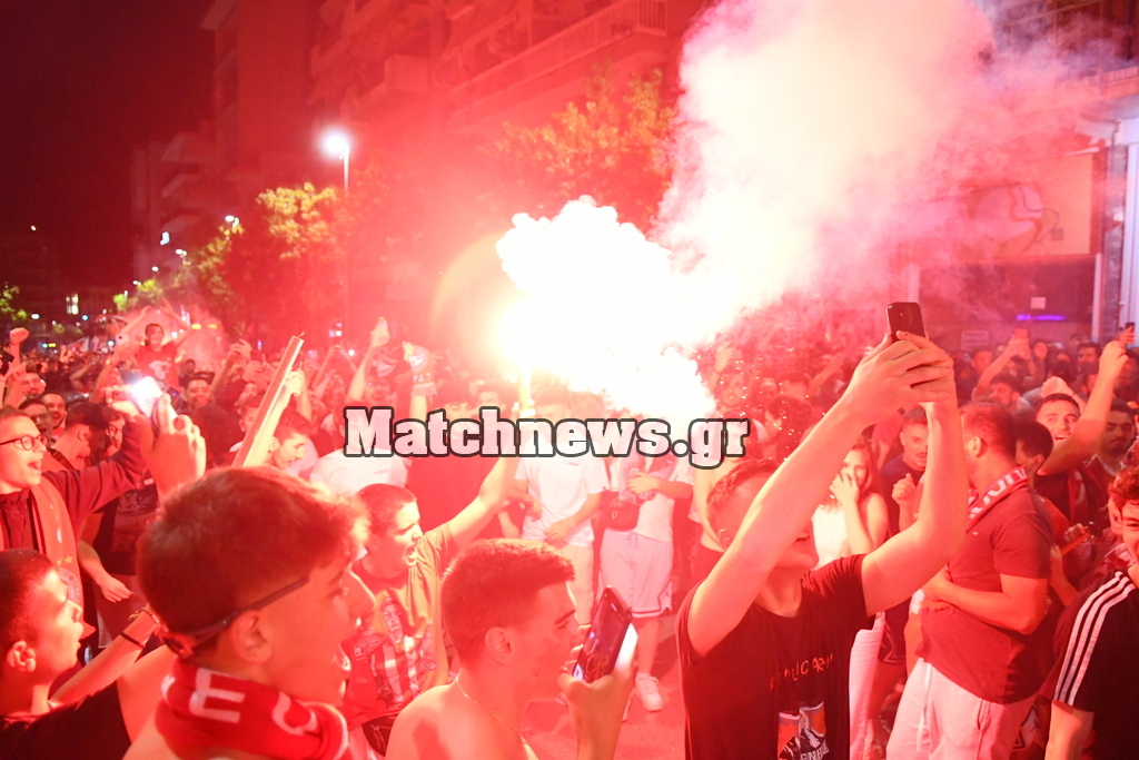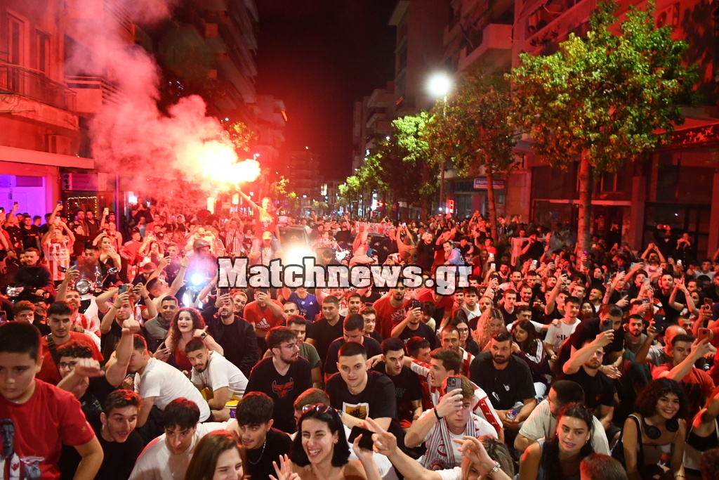 Οι πανηγυρισμοί σημειώνονται στην Οδό Γούναρη όπου ο αριθμός των φίλων των ερυθρολεύκων φτάνει ακόμα και τις 6.000, με το πάρτι να συνεχίζεται στην Πλ. Γεωργίου όπου μαζεύεται και άλλος κόσμος.