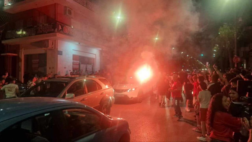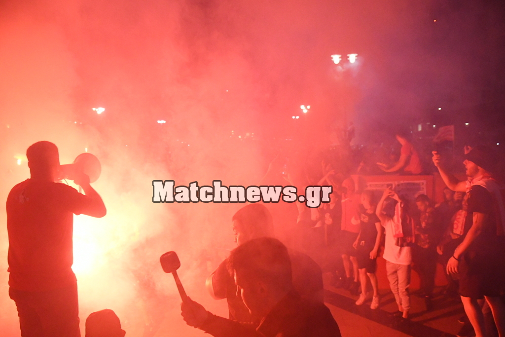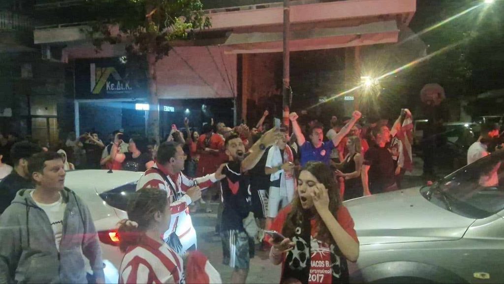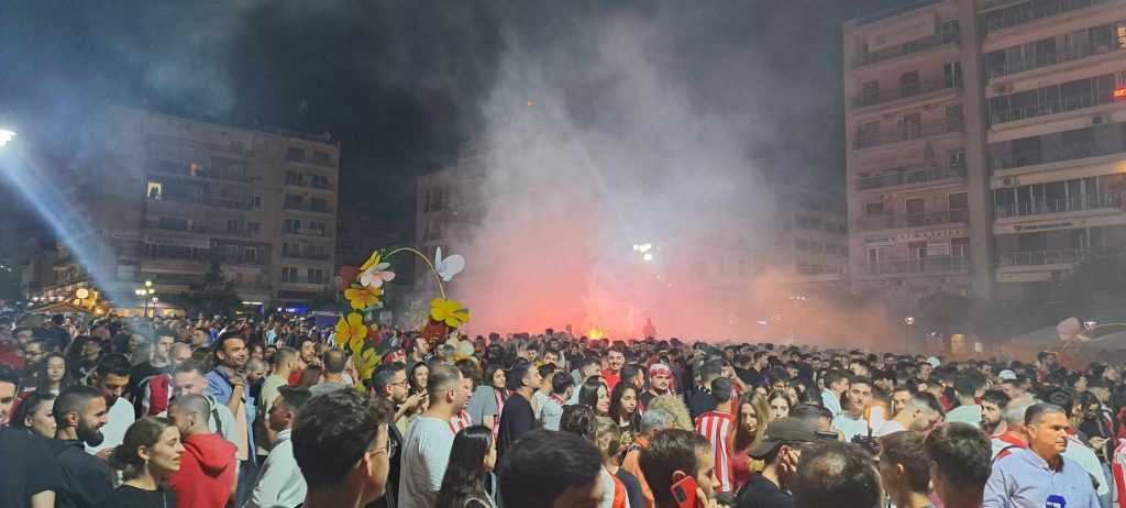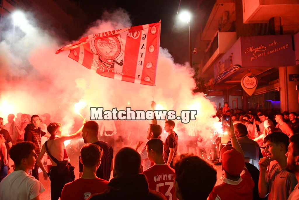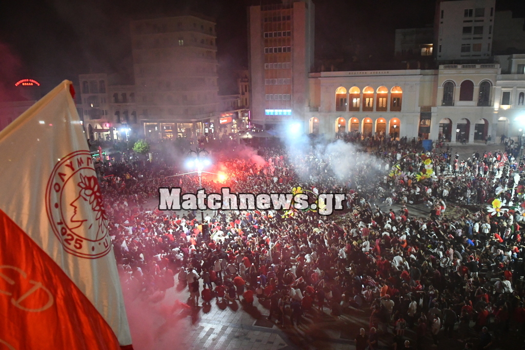 Οι πανηγυρισμοί σημειώνονται στην Οδό Γούναρη όπου ο αριθμός των φίλων των ερυθρολεύκων φτάνει ακόμα και τις 6.000, με το πάρτι να συνεχίζεται στην Πλ. Γεωργίου όπου μαζεύεται και άλλος κόσμος.
