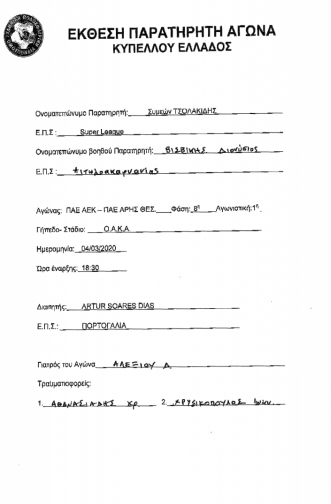 Πιο συγκεκριμένα, ο κ. Τσολακίδης αναφέρει τρία περιστατικά στην έκθεσή του για το χθεσινό ΑΕΚ- Άρης στο ΟΑΚΑ για τα ημιτελικά του κυπέλλου Ελλάδας.