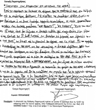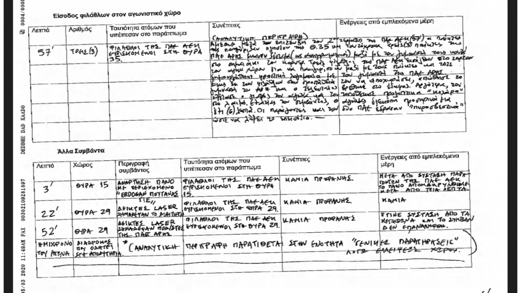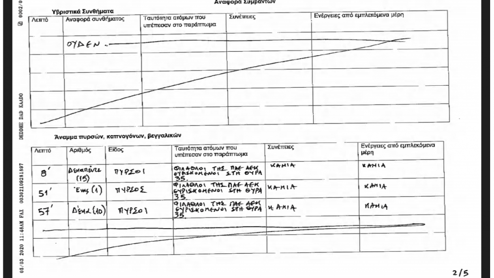 1. Όπως του είπαν οι διαιτητές, στην ανάπαυλα μη διαπιστευμένοι φίλαθλοι της ΑΕΚ επιτέθηκαν φραστικά στους διαιτητές. Ένας εξ αυτών πλησίασε τον πρώτο βοηθό διαιτητή, του είπε “I’m the boss”, του έπιασε τα γεννητικά όργανα και τα πίεσε. Και φώναζε “why penalty”, “no penalti” “fuck you all”