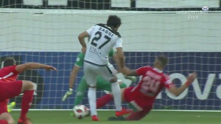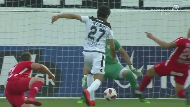 Ο ρέφερι από τη Θεσπρωτία, σε μια φάση που ακόμα και χωρίς ριπλέι ήταν ξεκάθαρη, είδε ανατροπή στην περιοχή σε μαρκάρισμα του Ποζατζίδη πάνω στον Σάσι, στο οποίο ξεκάθαρα ο παίκτης του Πλατανιά βάζει την προβολή ξεκάθαρα πάνω στην μπάλα.
