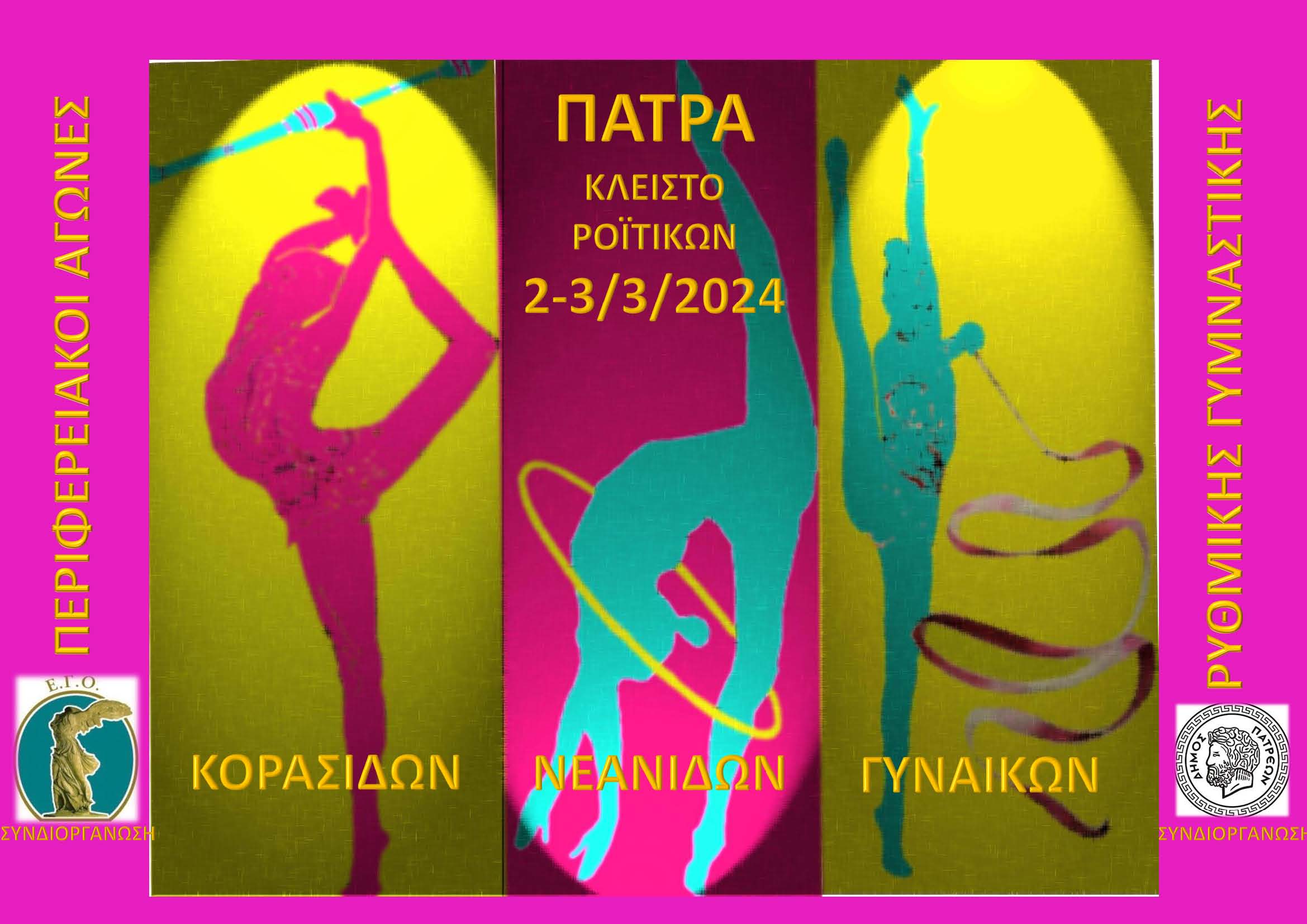 ΕΓΟ και ΑΕΣΓΔΕ σε συνεργασία με τον Δήμο Πάτρας διοργανώνουν το Σάββατο 2 Μαρτίου από 10.00 έως 21.00 και Κυριακή 3 Μαρτίου από 11.00 έως 17.30 τους διασυλλογικούς και περιφερειακούς αγώνες Ρυθμικής Γυμναστικής Γ΄ περιφέρειας (Δυτ. Ελλάδος, Πελοποννήσου, Ιονίων Νήσων και Ηπείρου) στο κλειστό γυμναστήριο Ροϊτίκων.